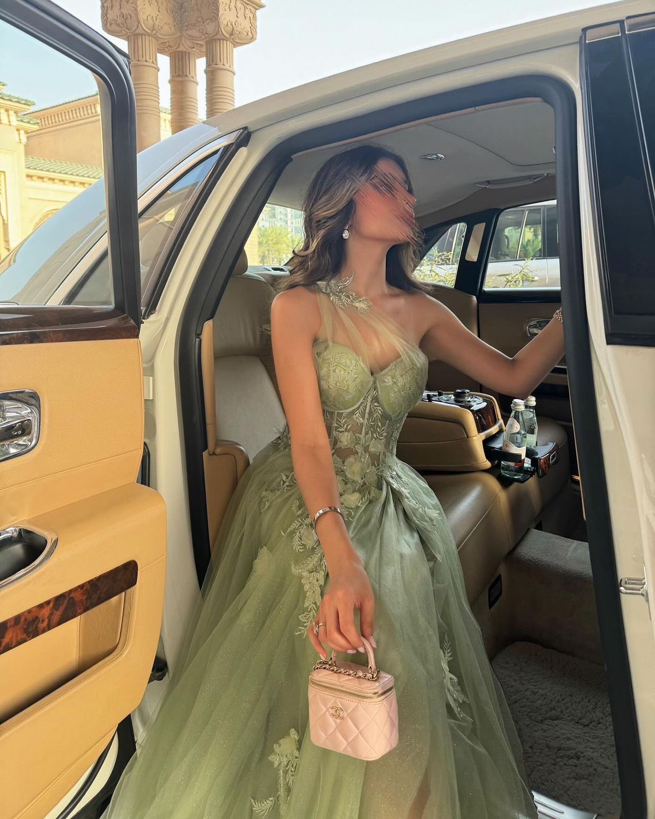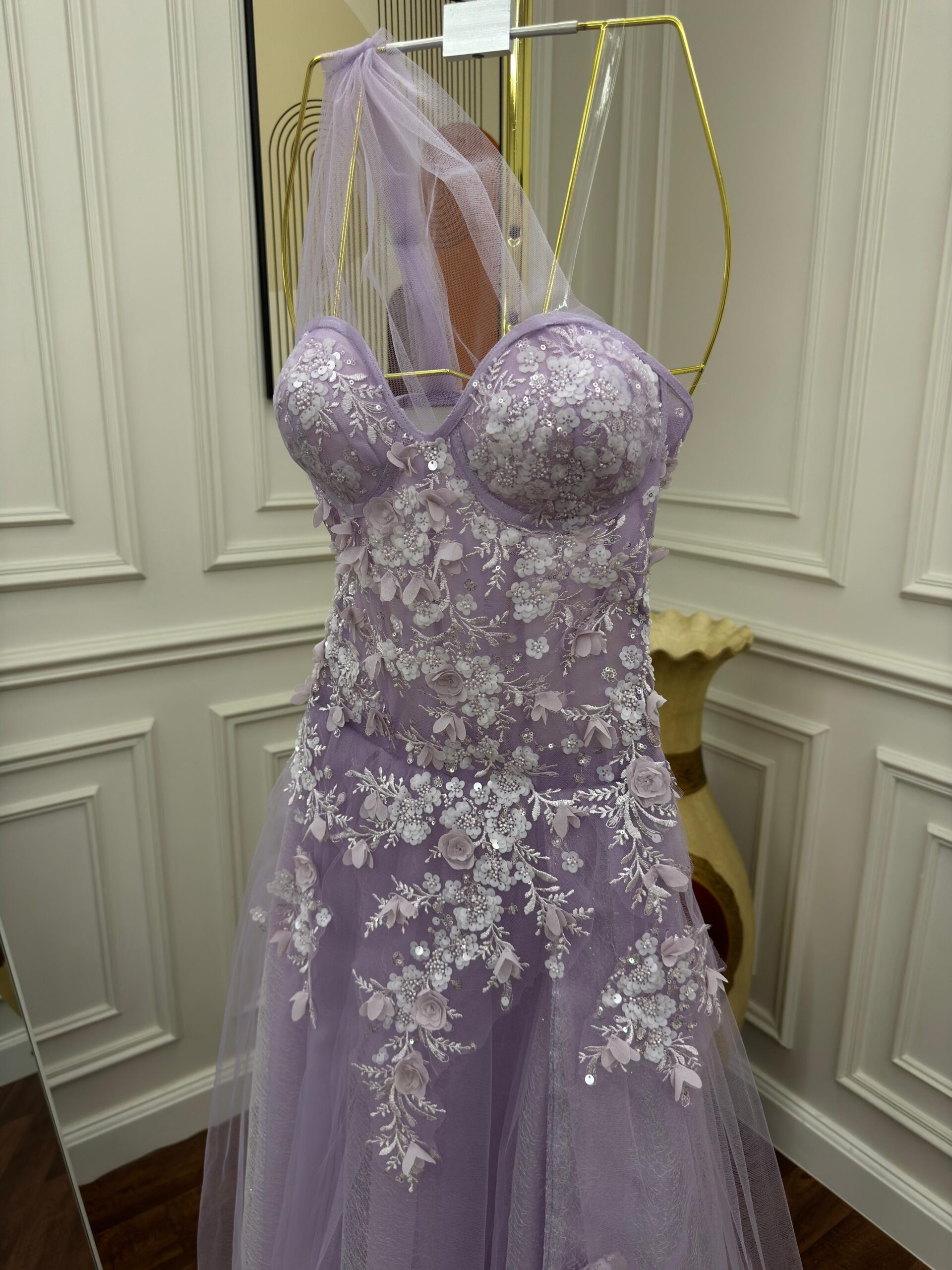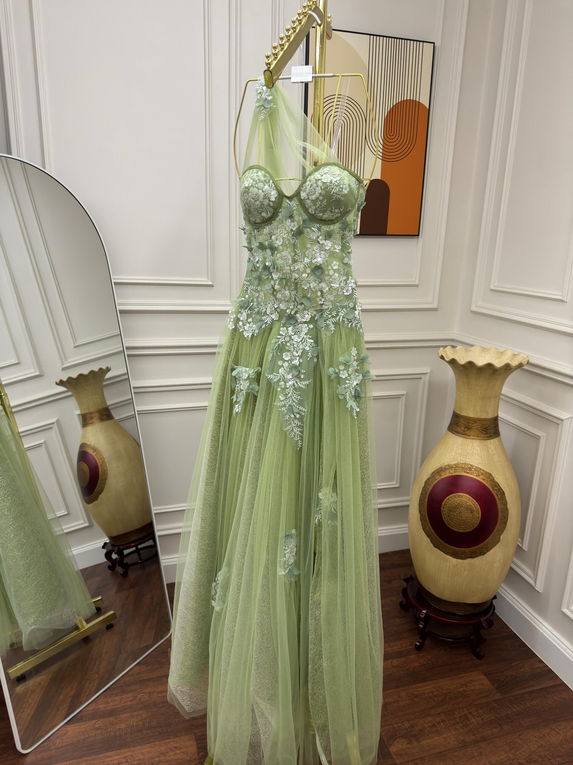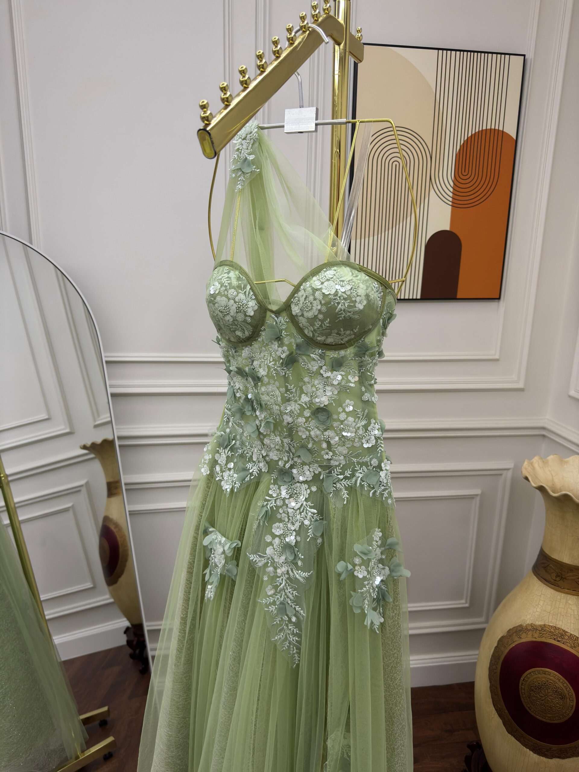 فستان سهرة طويل ، مصنوع من قماش التل الرقيق، ومزود بتفاصيل أنيقة مثل الزهور المطرزة على الصدر والتنورة. التصميم يبدو أنيقًا وفاخرًا، حيث يحتوي على فتحة عند الساق لإضافة لمسة من الجاذبية. الفستان يتميز بقصة صدر ضيقة بحمالات رفيعة، ما يبرز جمال الخصر والجزء العلوي بشكل رائع