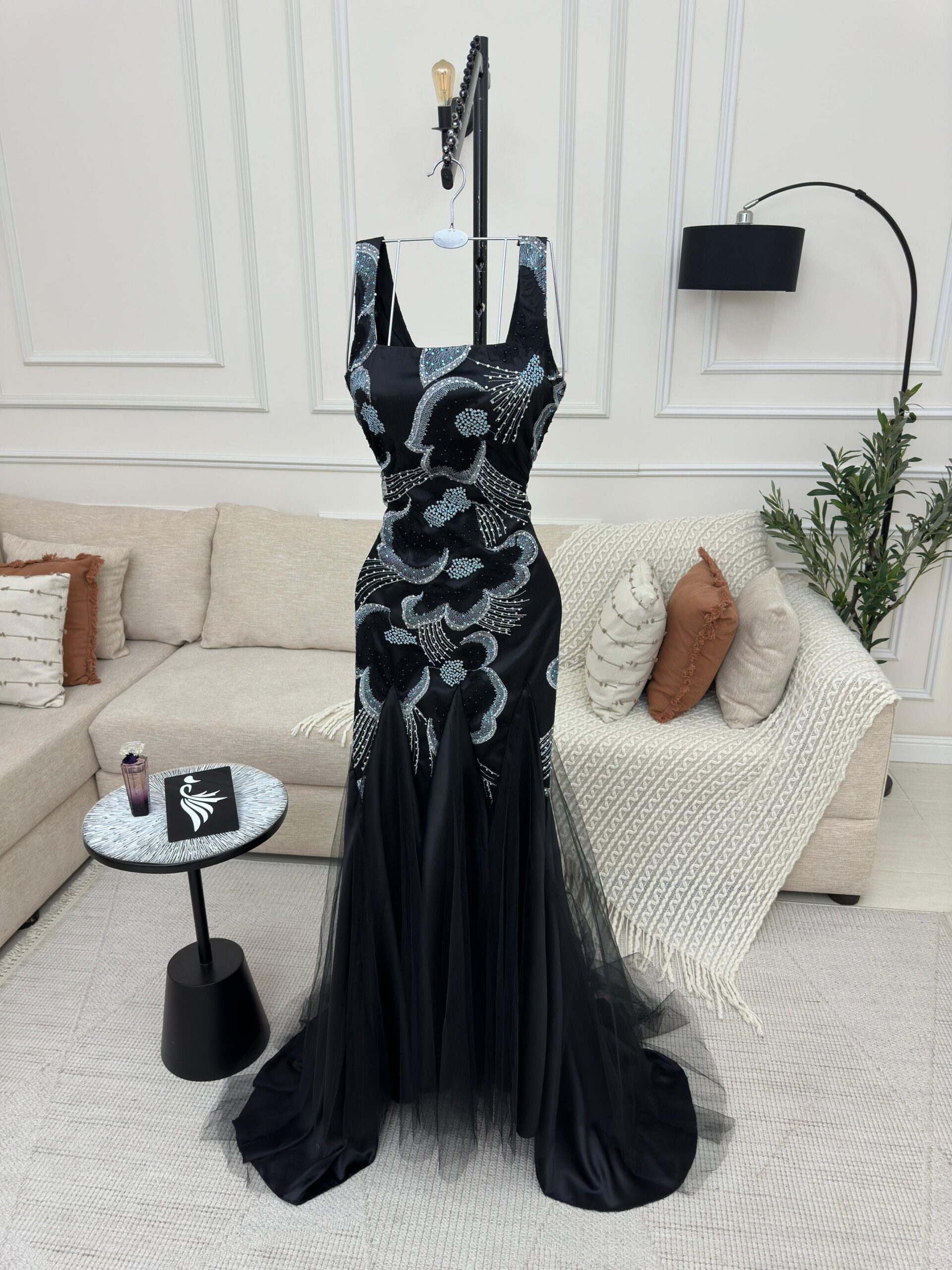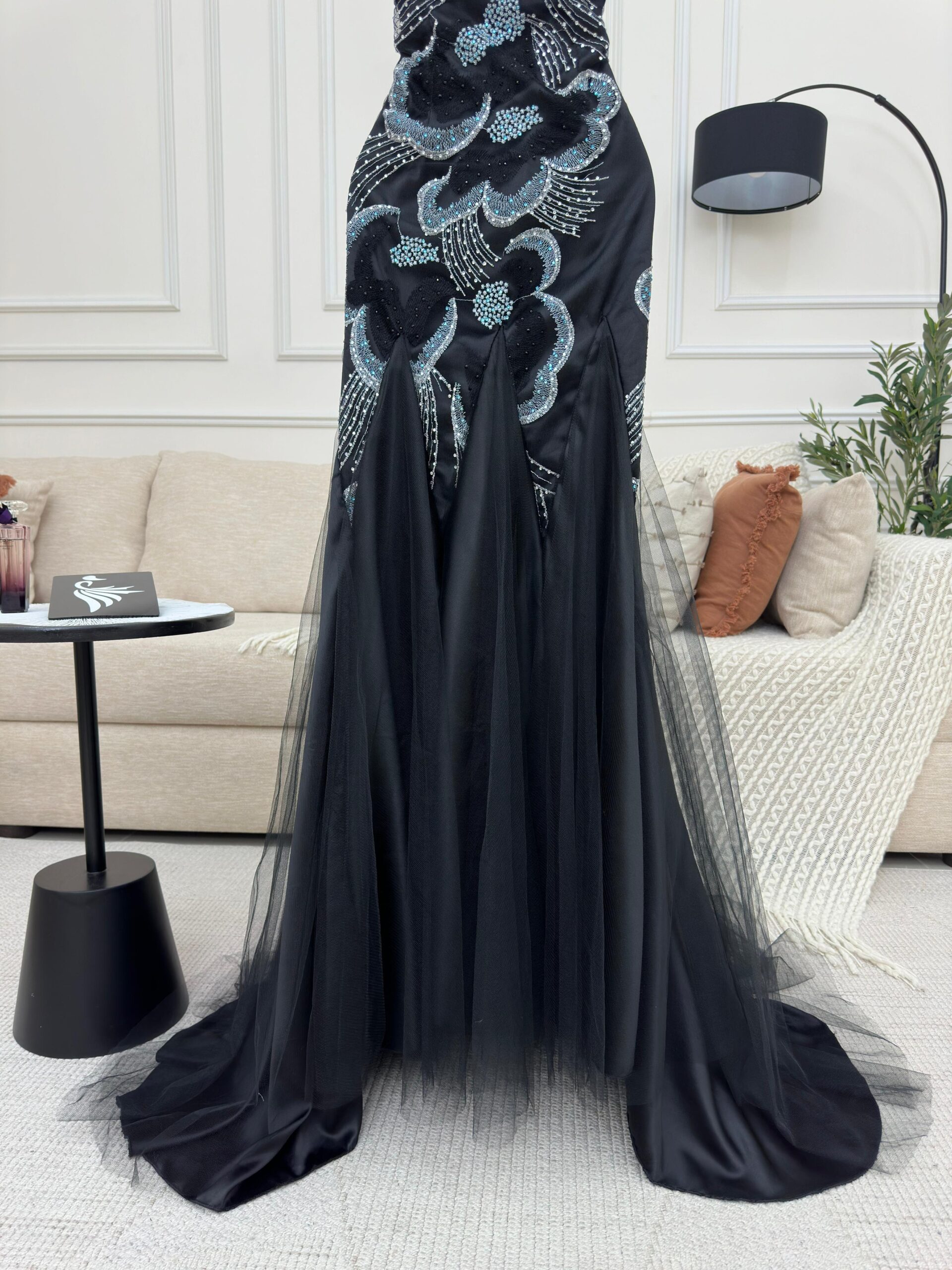 فستان نسائي أنيق أسود اللون مزينًا بالتطريزات اللامعة اللامعة التي تضفي مظهرًا فخمًا وجذابًا. تتميز بقصة بارزة من أعلى تُبرز تفاصيل الجسم مع تنورة عريضة وشفافة إلى الأرض. السيدة ميامي بشبكة على درج رخامي بدرابزين حديدي، مما يعطي خلفية تُكمل الإطلالة الفاخرة