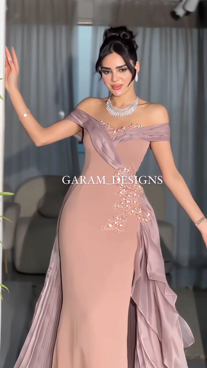 فستانًا أنيقًا بتصميم أنيق تطريزٍ، حيث تتميز بقصة كتف المكشوف (أوف شولد) مع تفاصيل حصرية بالكامل من الفخامة. ينتج قماش المنساب على الجانب الإطلالة ويمنحها مظهرًا ملكيًا، مما يجعل خيارًا مثاليًا للمناسبات الخاصة مثل حفلات الزفاف أو السهرات.