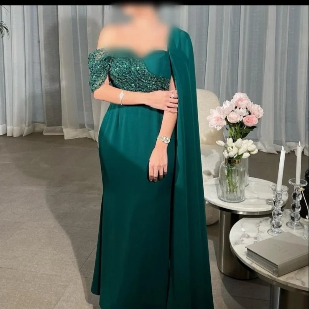 أجمل فستان سهرة لكرا كريب راقي مع كلفة مشجرة من الخرز والشك بطريقة راقية