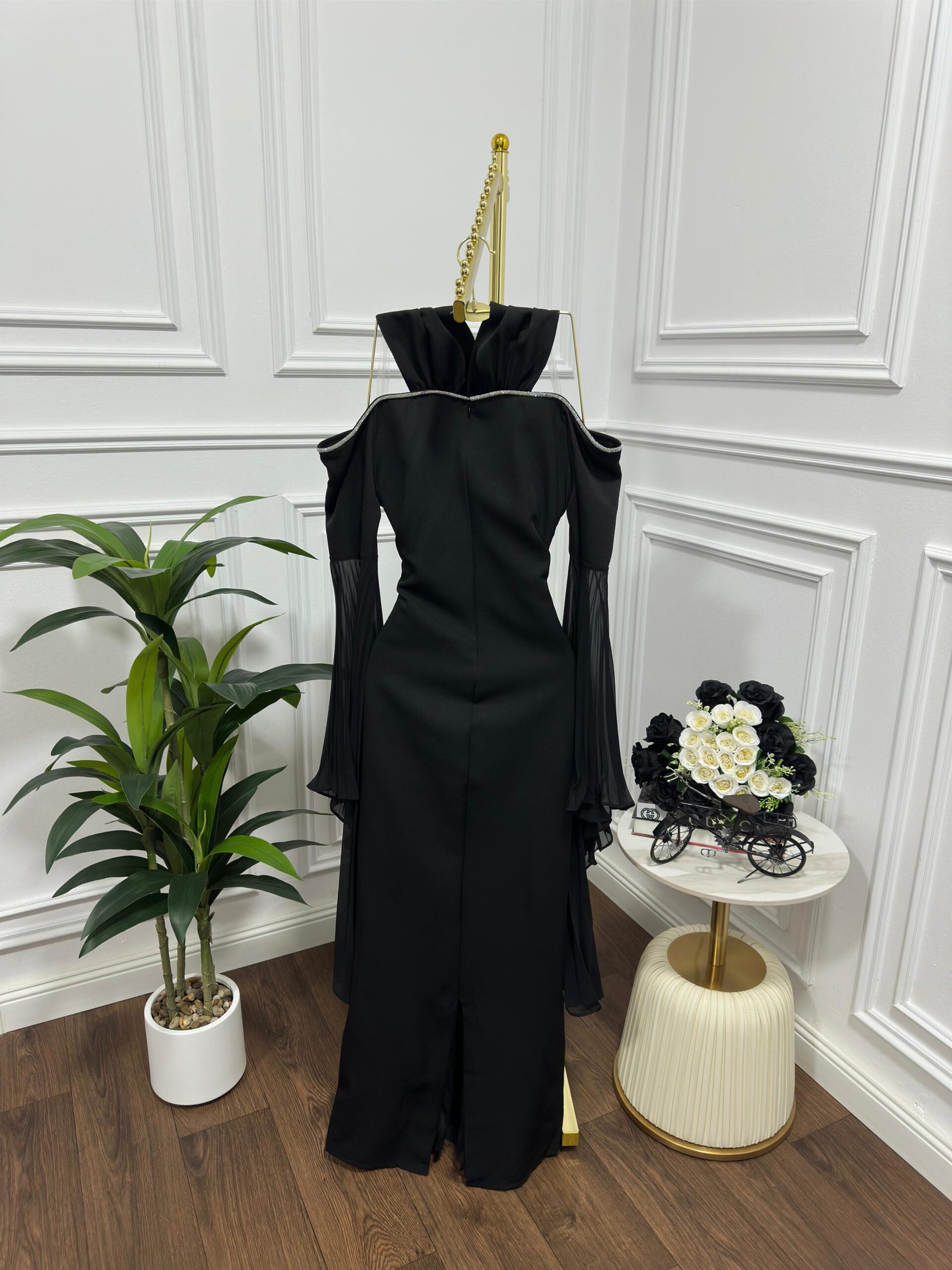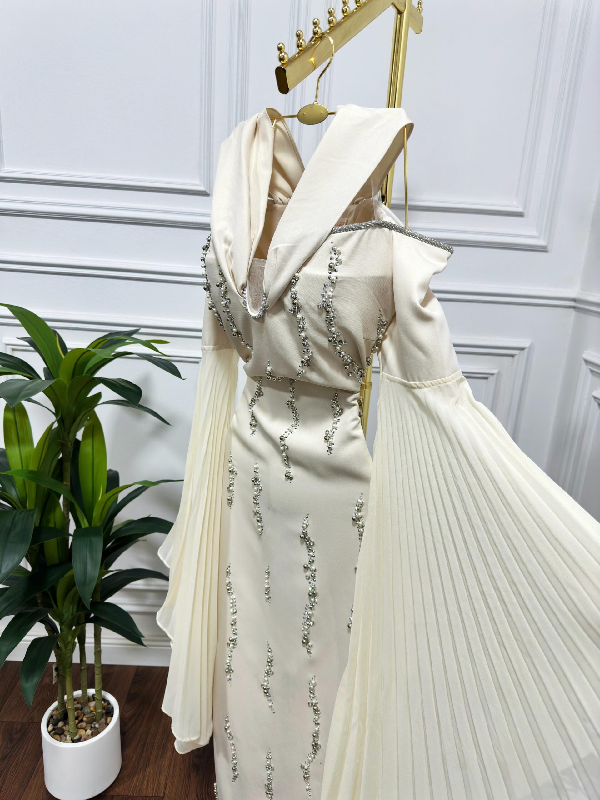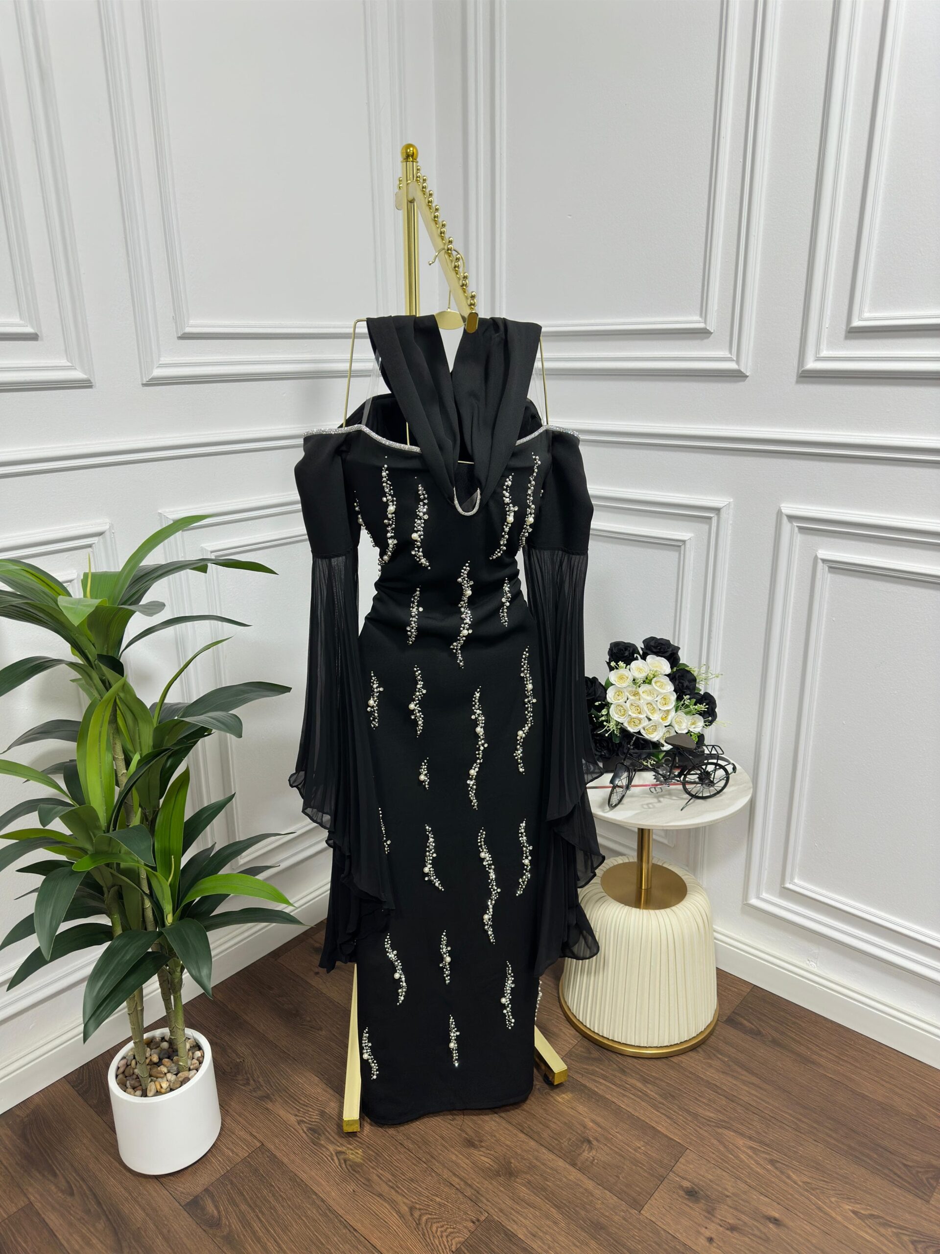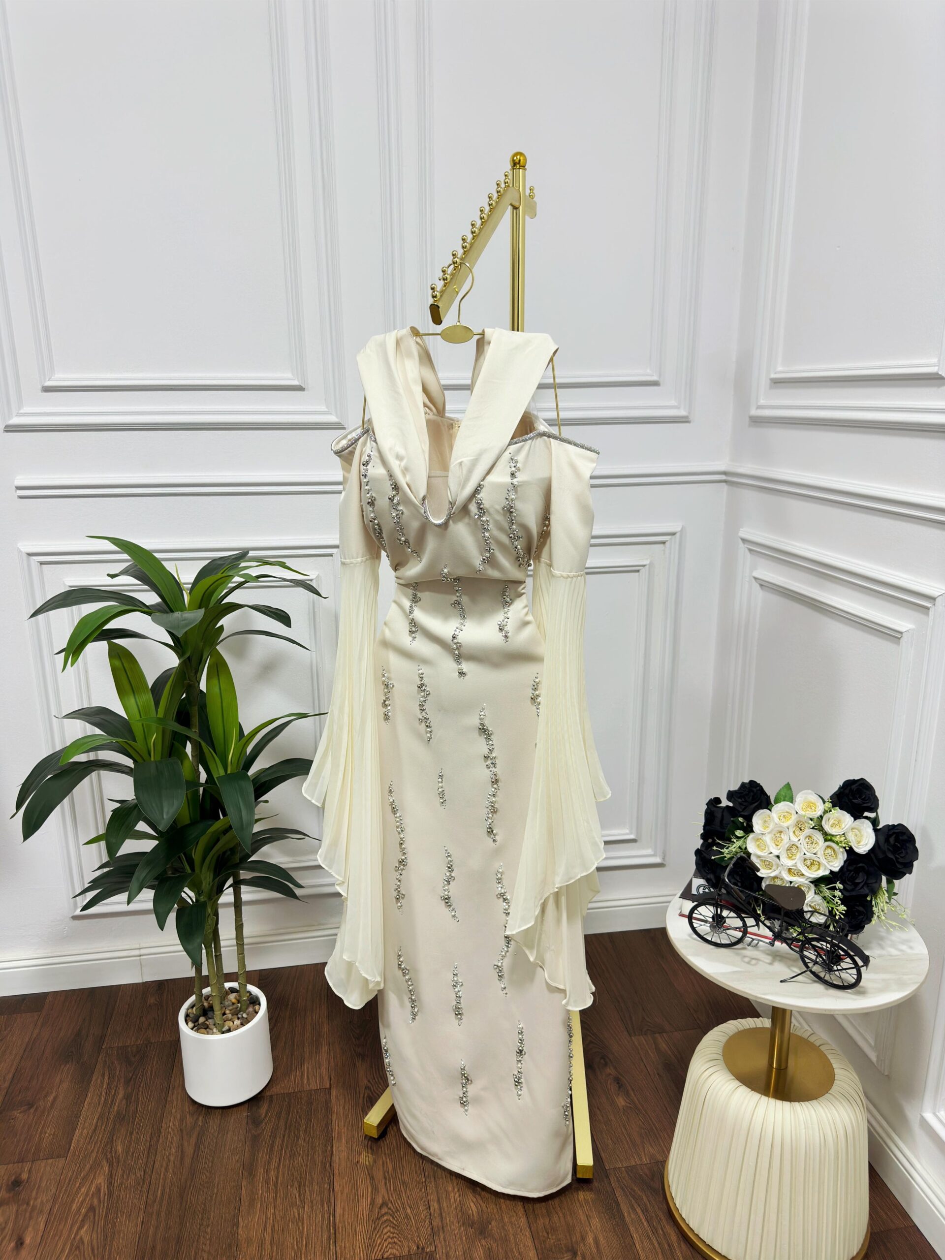 الوصف/ فستان سهره طويل باكمام طويله بلسيه واسعه مُزين بتطريز راقي ومميز